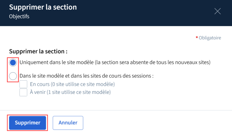 Lorsqu’une suppression doit être fait dans une section d'un site modèle, il est possible de l'appliquer dans les sites qui utilisent ce gabarit.