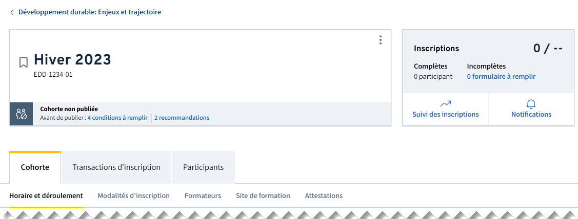 Le code de la cohorte (ex: EDD-1234-01) est ajouté automatiquement par Brio lors de la création de celle-ci. Si le code de la formation est modifié par la suite, le changement n'affectera pas le code des cohortes déjà existantes (il contiendra l'ancien code de la formation). Les nouvelles cohortes qui seront créées contiendront le nouveau code de la formation. Si la cohorte est supprimée, le code de cette cohorte ne sera pas réattribué à une autre cohorte.