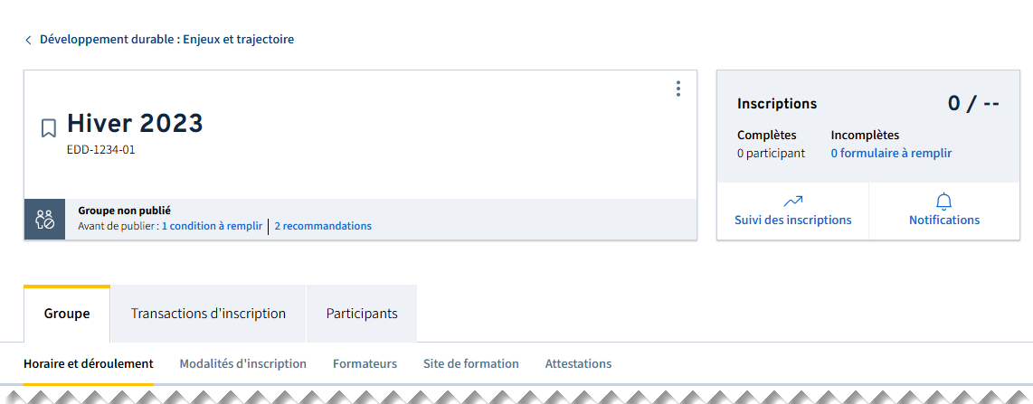 Le code du groupe (ex: EDD-1234-04) est ajouté automatiquement par Brio lors de la création du groupe. Si le code de la formation est modifié par la suite, le changement n'affectera pas le code du ou des groupes déjà existants (il contiendra l'ancien code de la formation). Les nouveaux groupes qui seront créés contiendront le nouveau code de la formation. Si le groupe est supprimé, le code de ce groupe ne sera pas réattribué à un autre groupe.