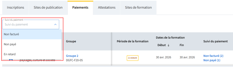 Pour préciser votre recherche, sélectionnez un statut dans le menu déroulant Suivi du paiement.