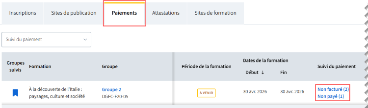Dans la colonne Suivi du paiement le statut des paiements en défaut s’affiche.