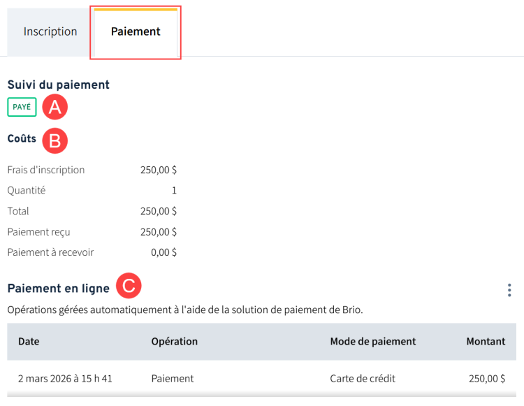 Le coût de la formation, ainsi que le paiement reçu ou à recevoir sont indiqués dans cette section.