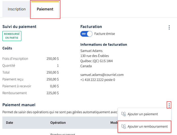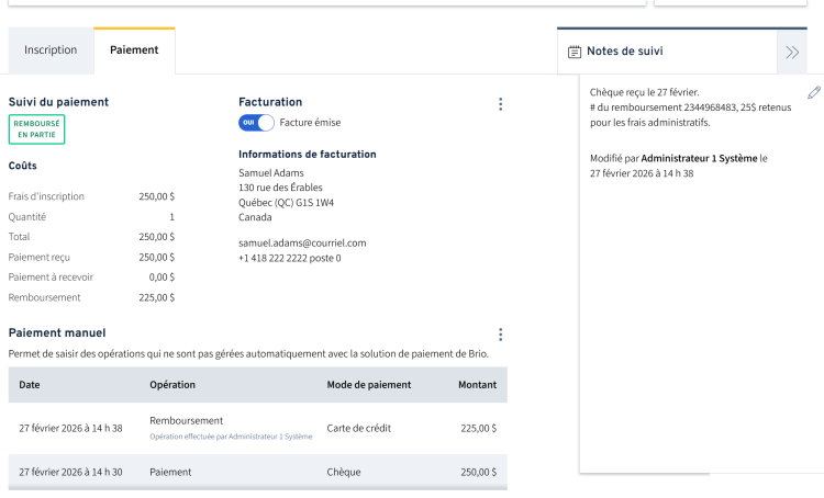 Les informations de remboursement manuel et la note de suivi sont automatiquement ajoutées. Le suivi de paiement change automatiquement à Remboursé ou Remboursé en partie, selon les cas.