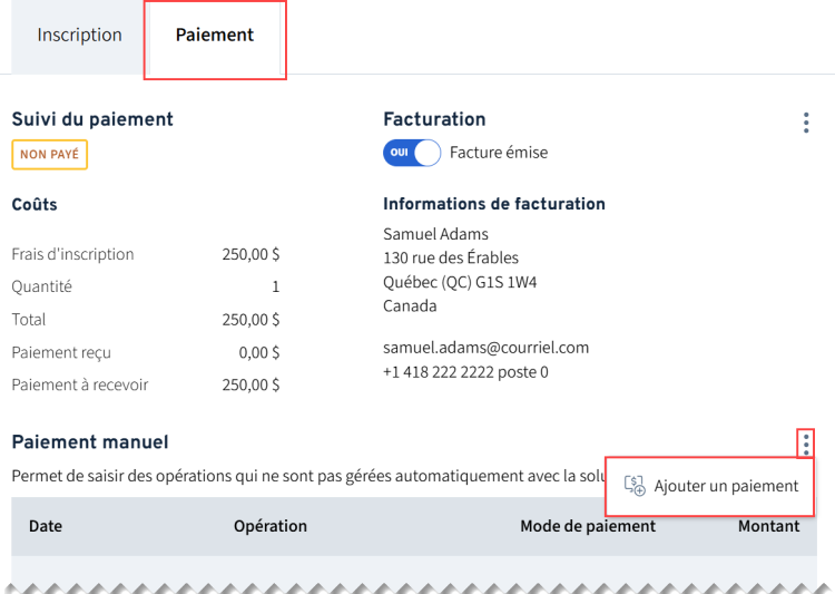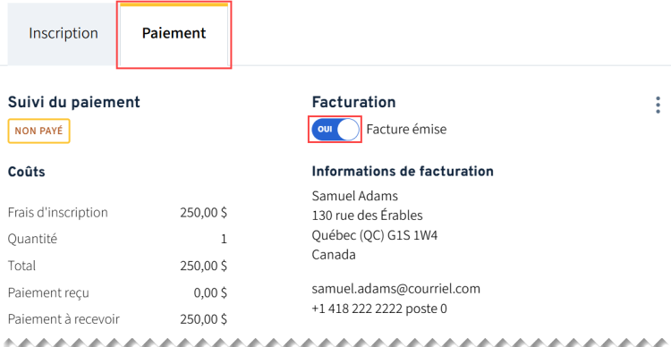 Rappel, il est de votre responsabilité d’envoyer une facture au participant. Le bouton à bascule ne sert que d’indicateur.