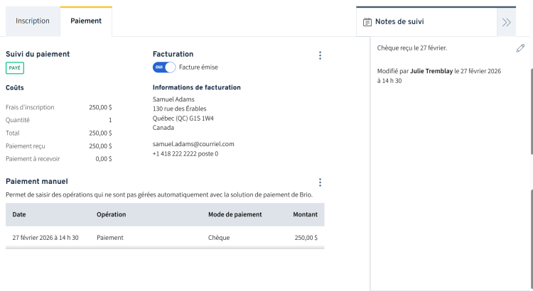 Lorsqu’un participant choisit de payer les frais d’inscriptions par facturation, Brio ne gère pas la facturation et ne reçoit pas automatiquement les informations liées aux opérations de paiement.