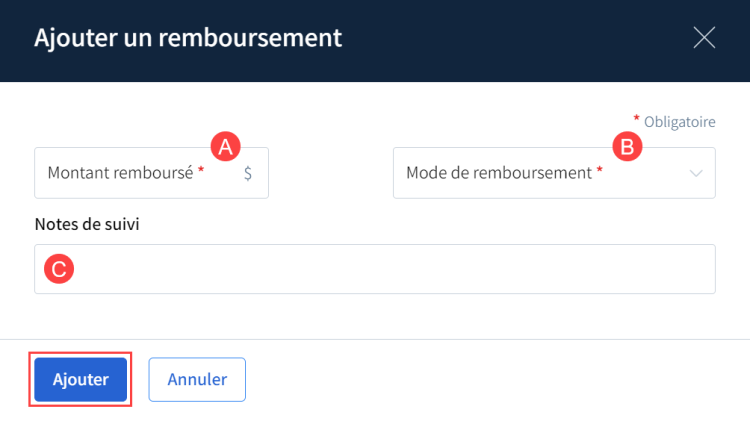 Sélectionnez le mode utilisé dans la liste déroulante Mode de remboursement.