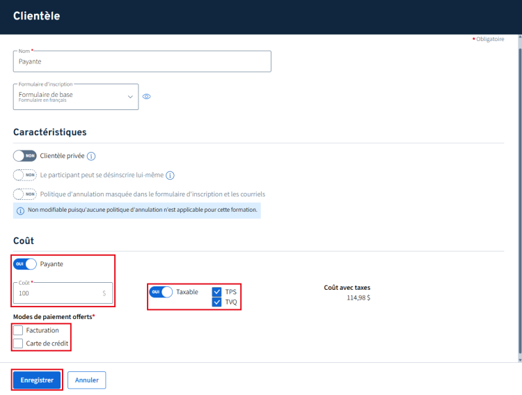 Pour paramétrer une formation payante, il est nécessaire de modifier cette clientèle ou d’en ajouter une. Ces modifications permettront d’offrir à vos participants de payer par carte de crédit ou à la réception d’une facture.