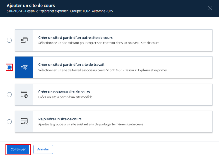 Le cours doit déjà contenir au moins un groupe ou une cohorte ayant un site de cours pour être en mesure de créer un site à partir d’un site existant.