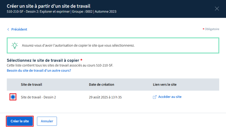 Le cours doit déjà contenir au moins un groupe ayant un site de cours pour être en mesure de créer un site à partir d’un site existant.