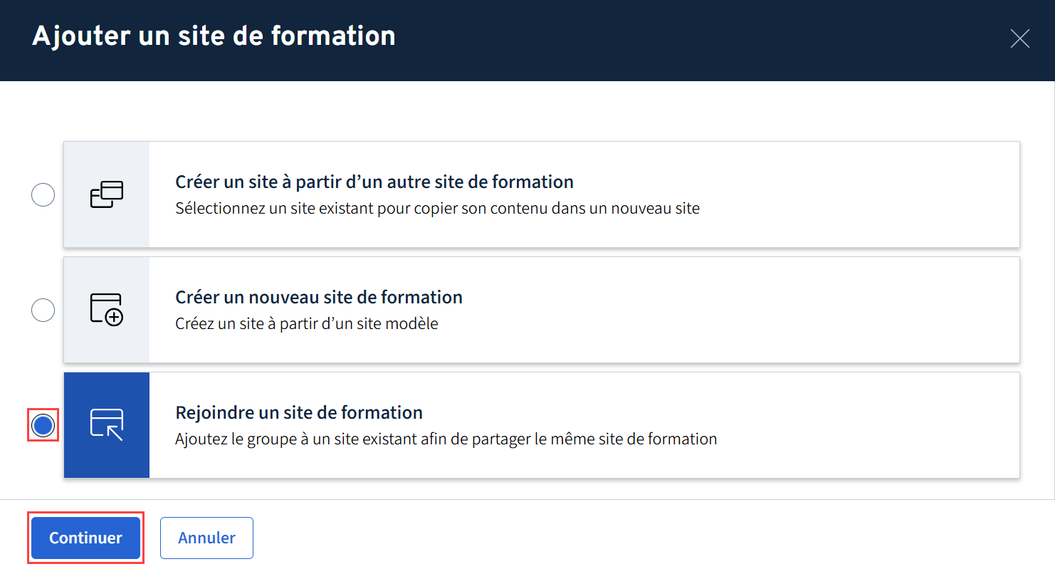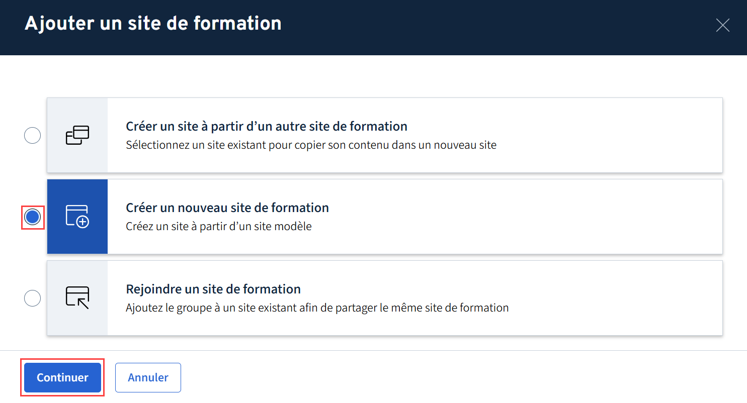La formation doit déjà contenir au moins un groupe ou une cohorte ayant un site de formation pour être en mesure de créer un site à partir d’un site existant.