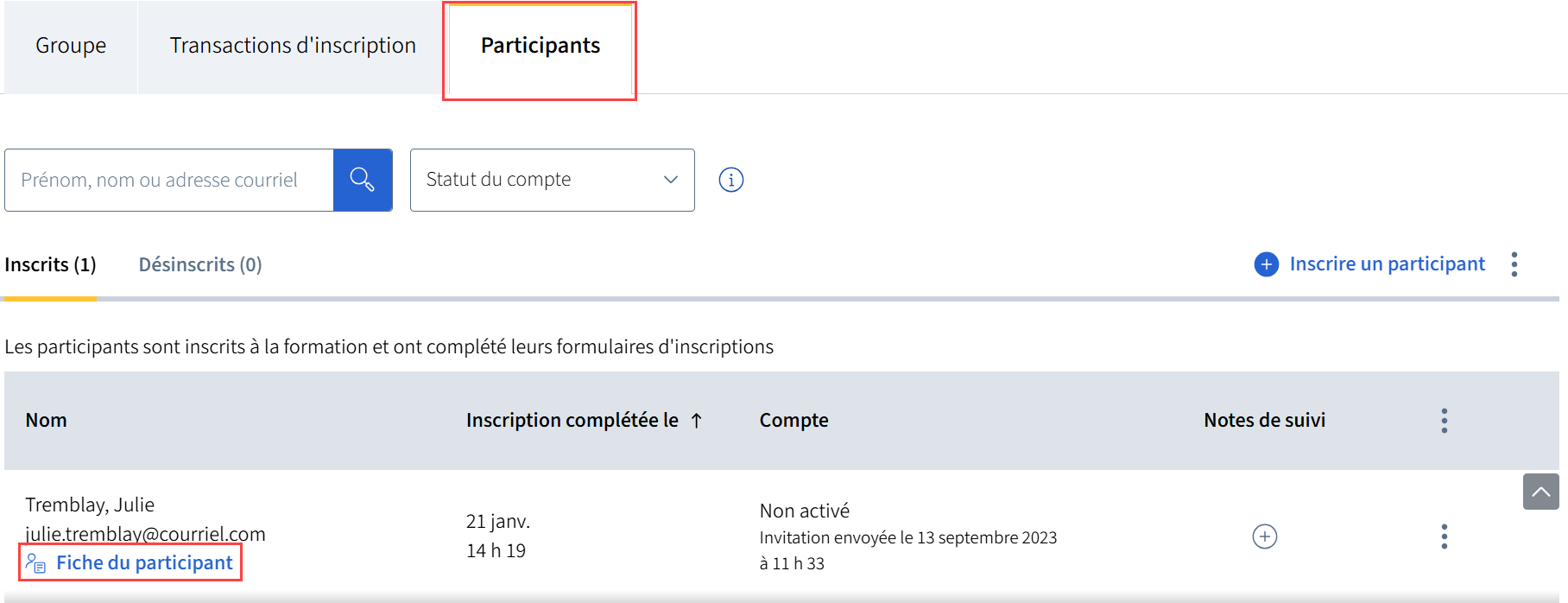 Inscrivez le nom ou l'adresse courriel du participant dans la barre de recherche.