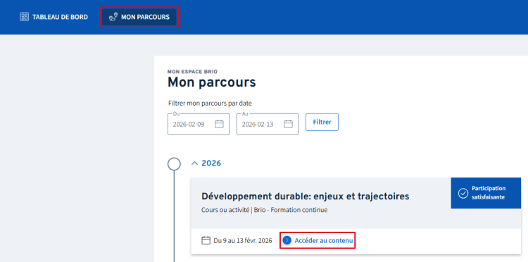 Une autoformation peut parfois demeurer accessible aux participants une fois celle-ci complétée. Pour ce faire, rendez-vous dans l’onglet Mon parcours. Repérez l’autoformation ciblée, puis cliquez sur Accéder au contenu.