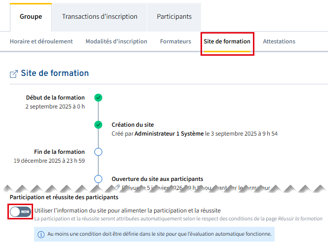 Lors de la copie du site dans un nouveau groupe, assurez-vous de désactiver l’évaluation automatique puisque celle-ci s’activera automatiquement. Cette action empêchera l'émission automatique d'une attestation à la suite de la complétion de ces évaluations non contributoires.