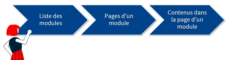 Ce menu peut être composé de différentes pages informationnelles (page blanches et pages typées), de la page Réussir la formation et de la page contenant la séquence d’apprentissage, de type Modules. Il peut aussi contenir un regroupement de pages.