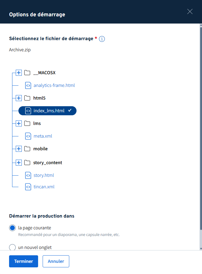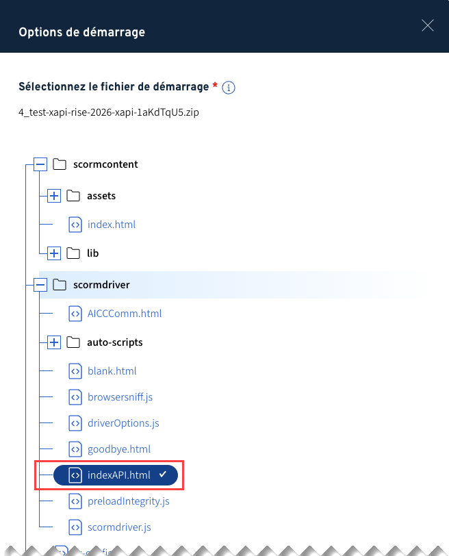 Le fichier de démarrage correspond au fichier initial qui lance la production multimédia dans le navigateur et qui initialise la communication avec le système de suivi xAPI de Brio.