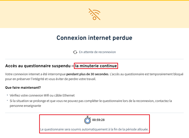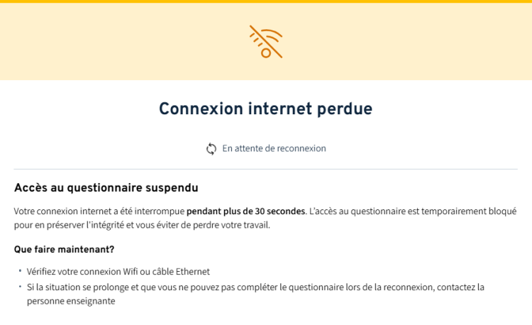 Si la connexion n’est toujours pas rétablie après 30 secondes, un message d’avis s’affiche et l’accès au questionnaire est alors temporairement bloqué. Vous devrez attendre le retour de votre connexion pour pouvoir poursuivre.