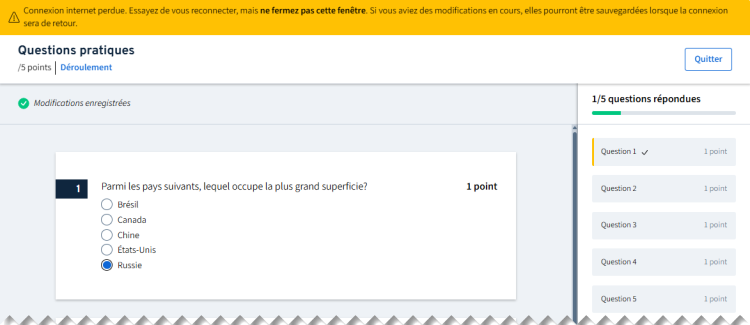 Lorsque votre connexion internet est interrompue pendant que vous répondez à un questionnaire, un message d’avis apparaît automatiquement en haut de la page pour vous informer de la connexion internet perdue.