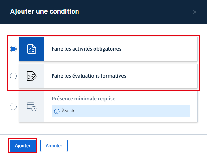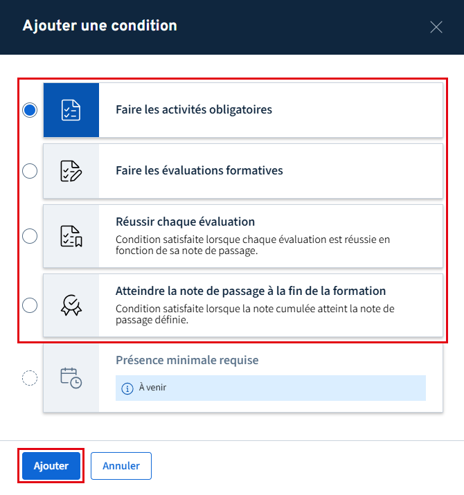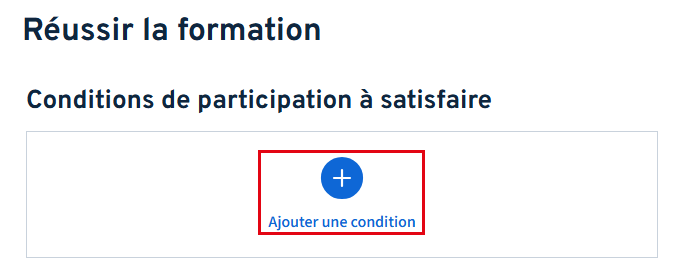 Pour toute information sur chacune des conditions, consultez la procédure Configurer les conditions à satisfaire pour réussir la formation.