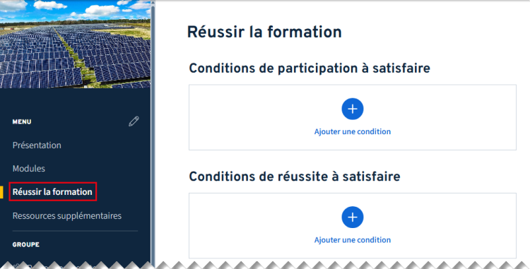 Pour ajouter des conditions à satisfaire pour réussir la formation, deux fonctionnalités doivent avoir été paramétrées: