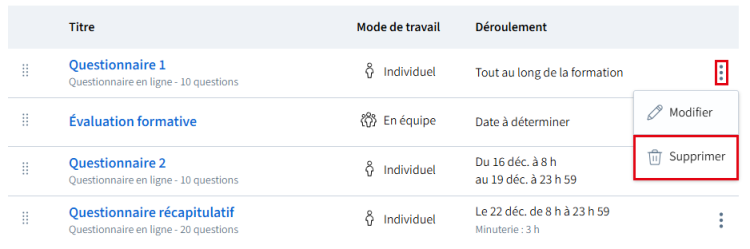 Supprimer une évaluation dans la liste
