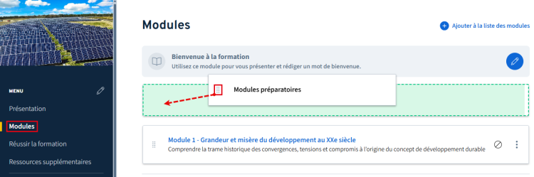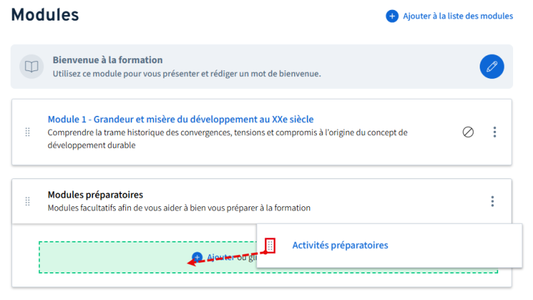 Il est également possible de déplacer un module à l’intérieur d’un regroupement, ou à l’inverse, déplacer un module à l’extérieur d’un regroupement.