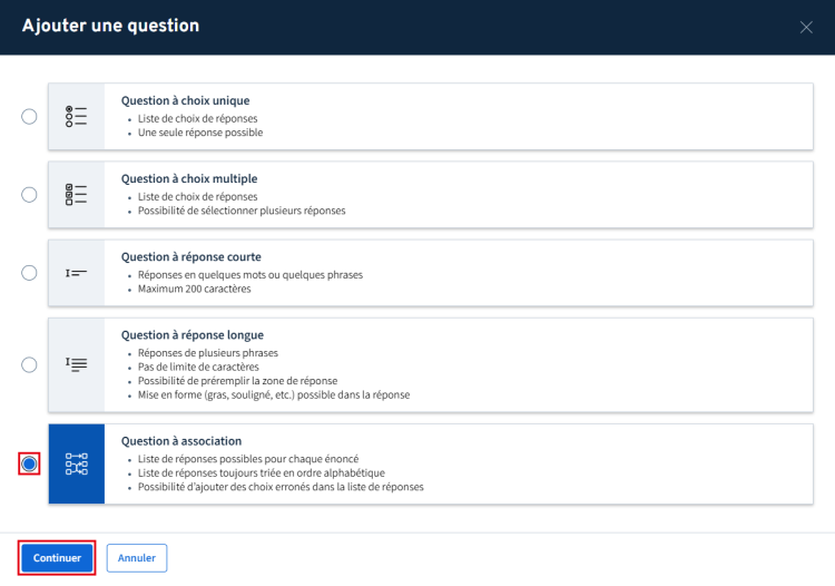 Inscrivez chaque énoncé avec sa réponse correspondante dans la Liste des réponses. Au besoin, cliquez sur Ajouter une association afin d’ajouter d’autres champs.