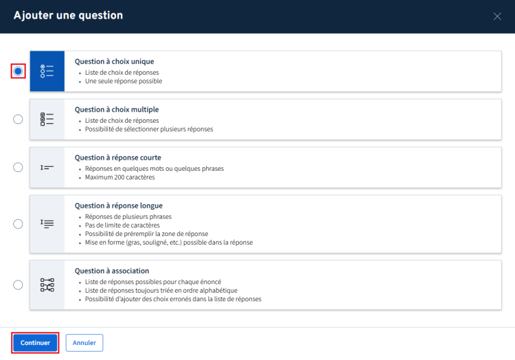 La fenêtre Ajouter une question – Choix unique s’ouvre.