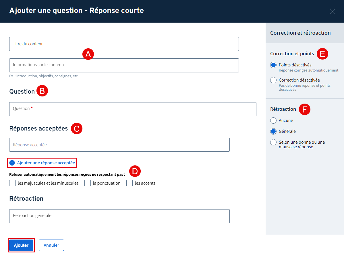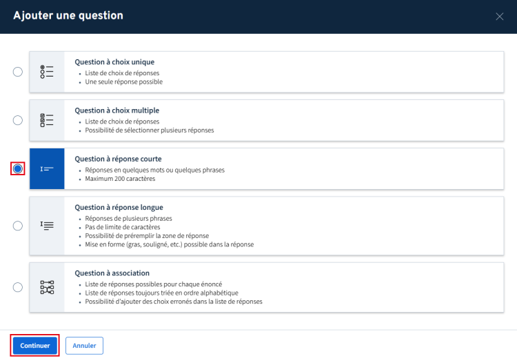 La fenêtre Ajouter une question - Réponse courte s’ouvre.