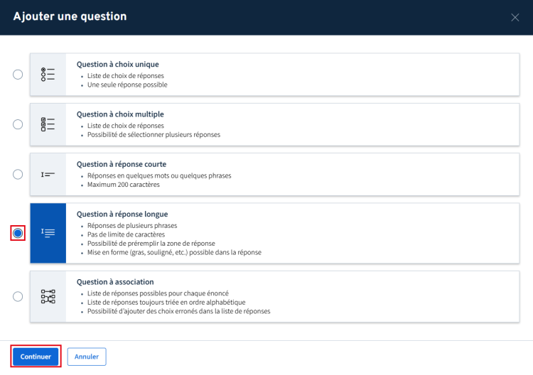 La fenêtre Ajouter une question - Réponse longue s’ouvre.