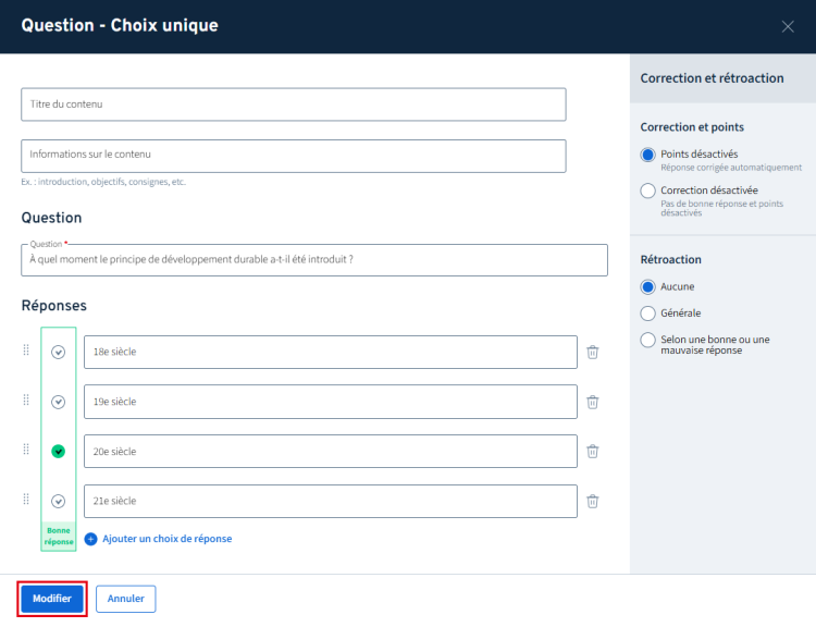 - Correction désactivée: aucun point n’est attribué pour cette question et la notion de bonne ou de mauvaise réponse n’existe pas.