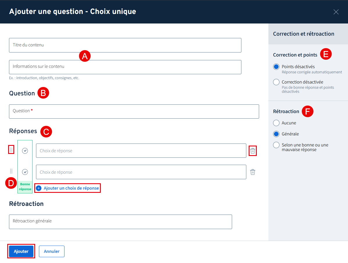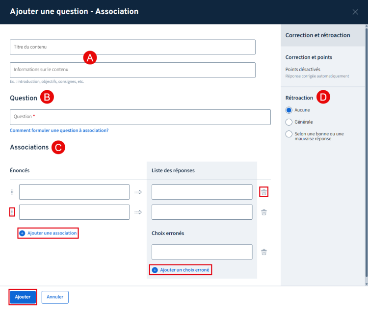 Si souhaitez, cliquez sur Ajouter un choix erroné afin d’ajouter un champ. Ces choix erronés sont présentés dans la même liste de réponses possibles pour chaque énoncé et permettent d’augmenter le niveau de difficulté.