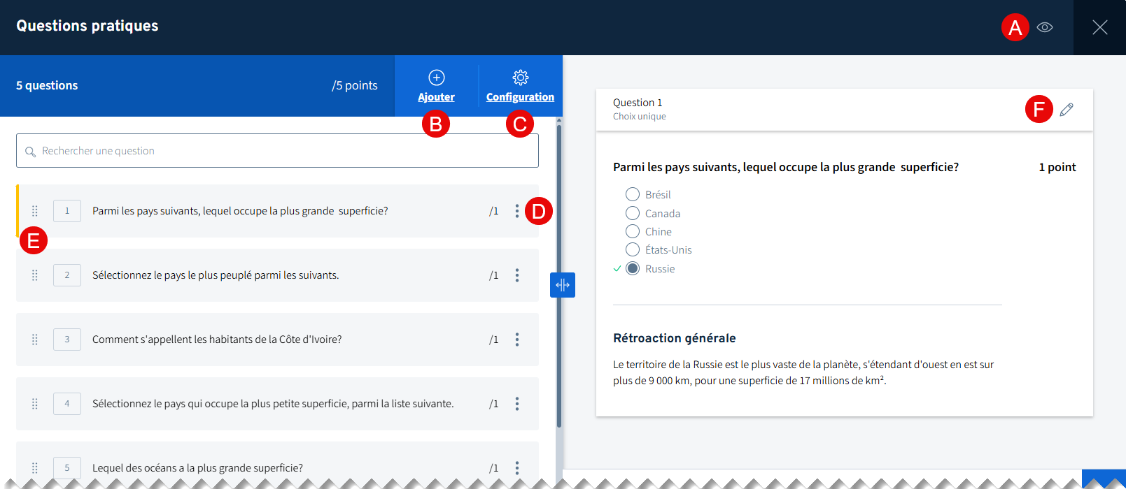 Consultez les pages Ajouter ou modifier une question, Supprimer une question et Annuler une question pour les procédures complètes.