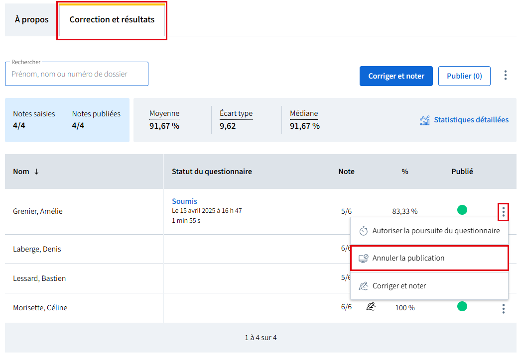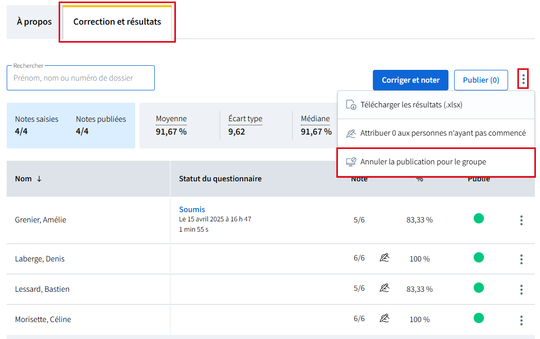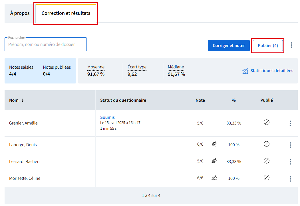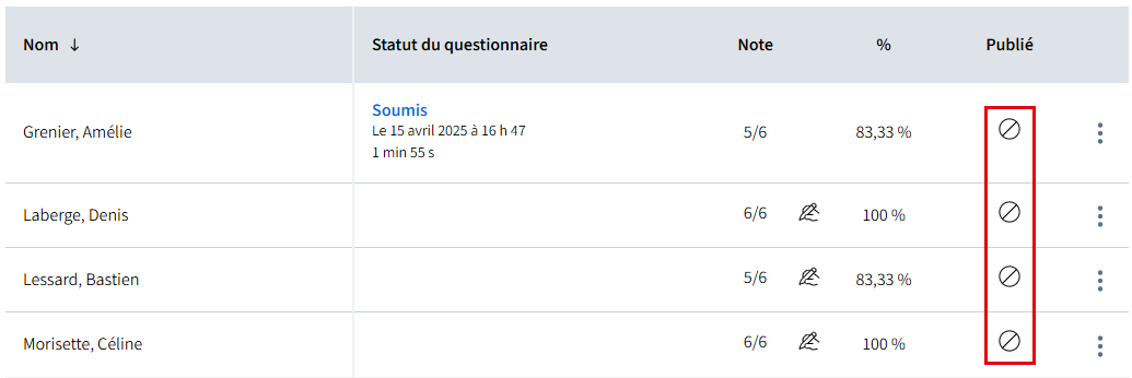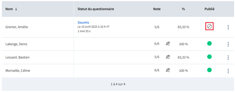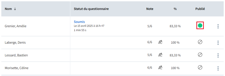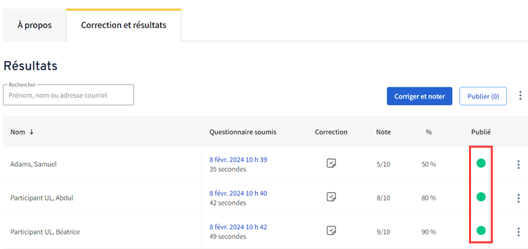 Les résultats sont automatiquement publiés aux participants et le statut de publication s’affiche dans le tableau des résultats.