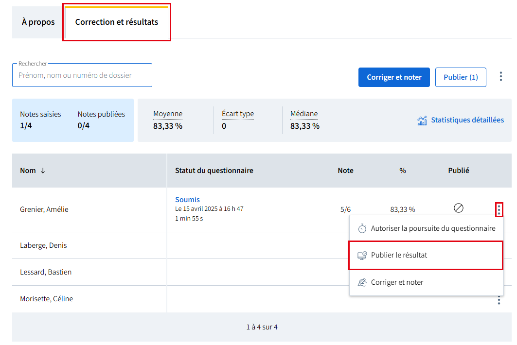 Cliquez sur l’icône du menu d’option du participant pour qui vous désirez publier le résultat.