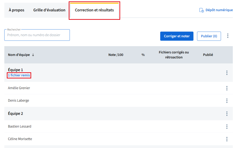 - Via le fichier remis par équipe dans l’onglet Correction et résultats :