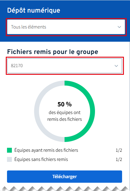 Lorsqu’un site est partagé par plusieurs groupes, un menu déroulant s’affiche également, et il est possible de sélectionner le groupe pour lequel vous souhaitez consulter les fichiers remis.