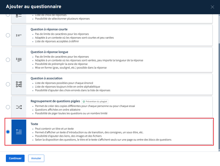 Ajouter un bloc de texte dans un questionnaire
