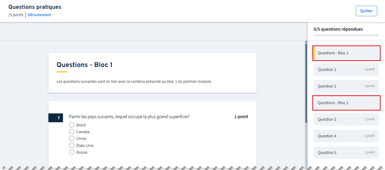 Selon la disposition des questions, le titre et le texte s’affichent seuls sur une page ou entre des blocs de questions. Le bloc de texte s’affiche en tout temps dans le sommaire des questions.