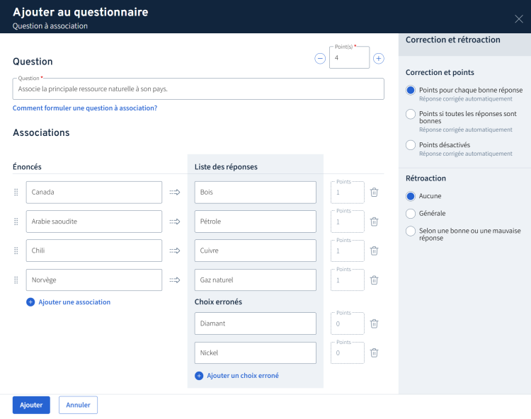 Un formateur ou un enseignant peut maintenant ajouter une question à association dans un questionnaire ou dans un module.