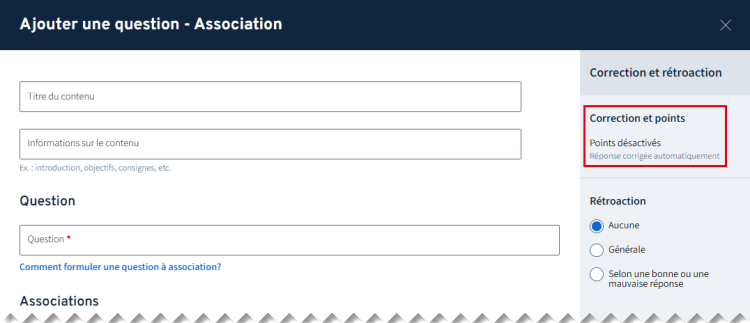Notez que l'option de correction d'une question à association en tant qu'élément de contenu dans un module n'est pas disponible. La réponse est corrigée automatiquement et les points sont désactivés.