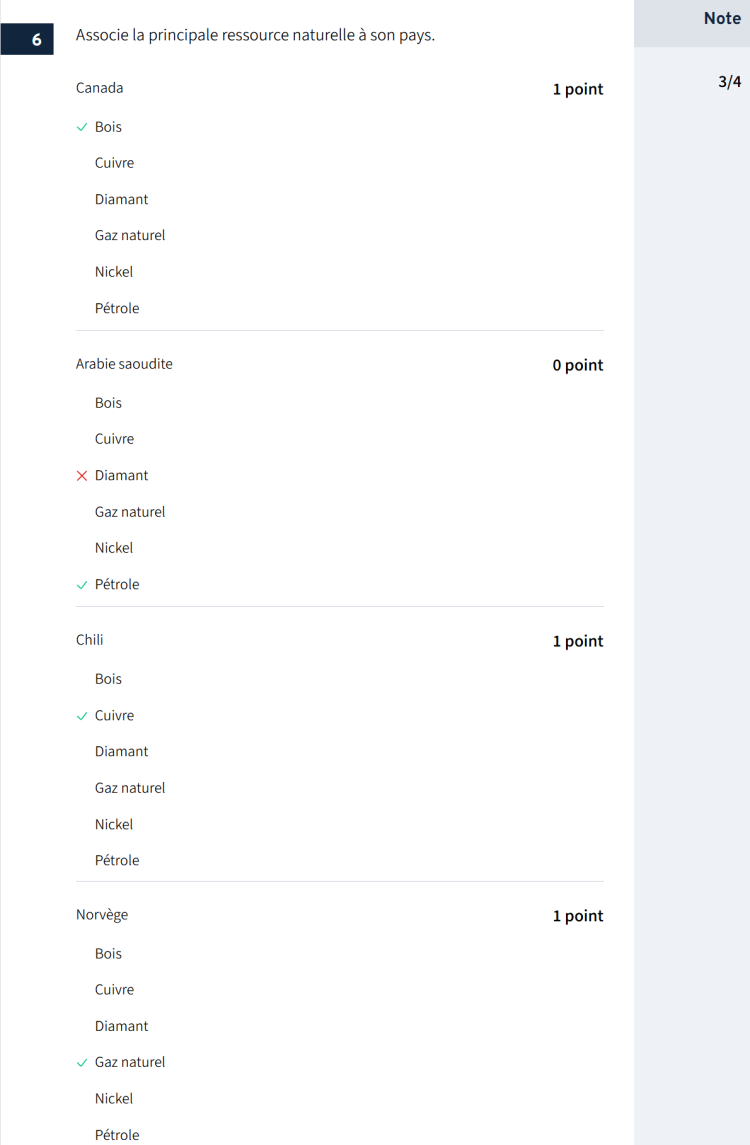 Dans la version corrigée, l’apprenant peut voir ses réponses, savoir lesquelles sont exactes et visualiser les mauvaises associations.