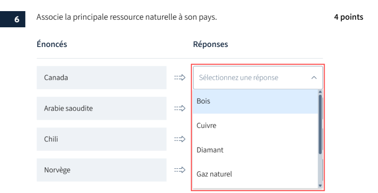 Vue apprenant: les choix de réponses s’affichent dans un menu déroulant en ordre alphabétique ce qui limite les associations trop évidentes. L’apprenant voit également le nombre total de points associés à la question, mais pas pour chacune des réponses.