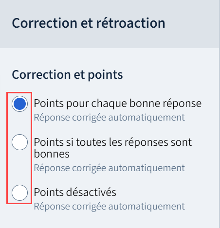 Si l’option Points pour chaque bonne réponse est sélectionnée, le pointage est réparti équitablement entre chaque énoncé.