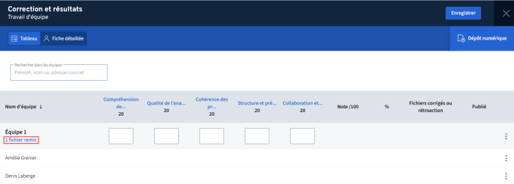 Le tableau de correction et résultats permet également d’accéder aux fichiers remis par les équipes et à la grille de correction, optimisant ainsi les tâches liées à l’évaluation.