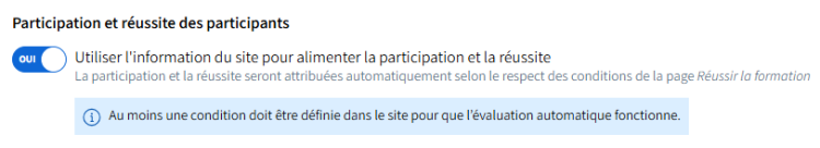 Lorsque l’ensemble des conditions définies dans le site de formation sont satisfaites, le système attribue automatiquement une participation Satisfaisante ou un résultat Succès.