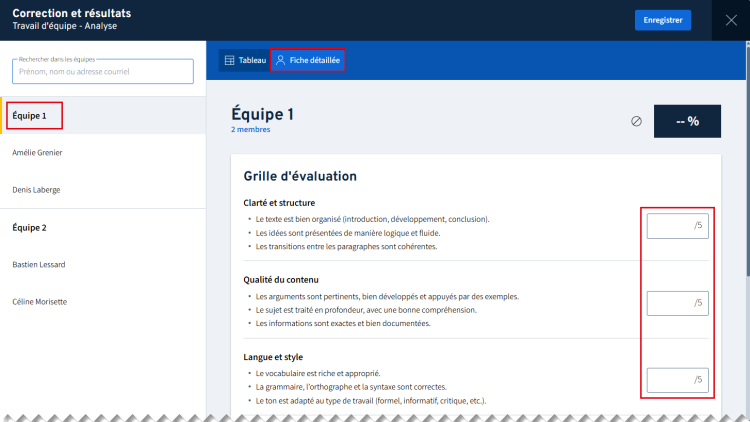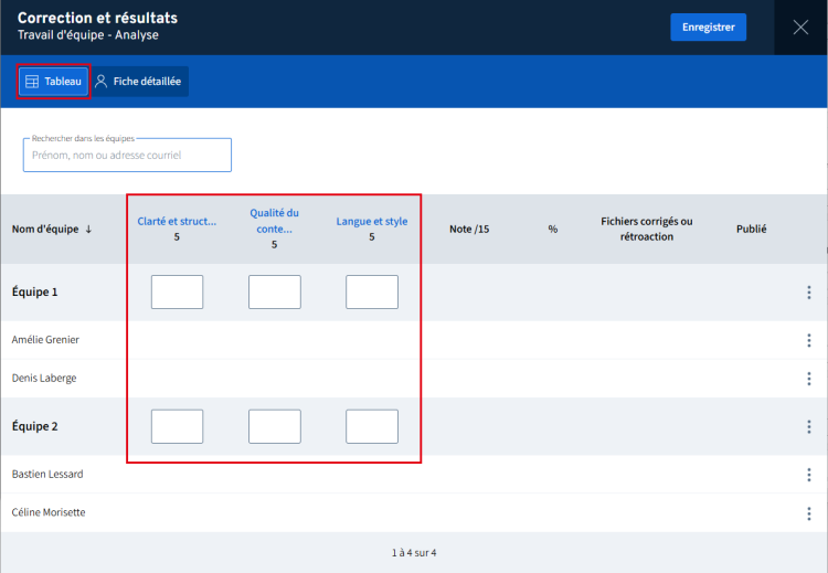Une personne responsable de la correction peut maintenant utiliser la grille d’évaluation pour saisir les résultats d’une évaluation en équipe.